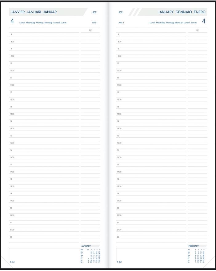 12.8 cm breed x 33 cm hoog. 1 dag verdeeld over 2 pagina's. 400 pagina's. Gebonden. 8-20 uur.